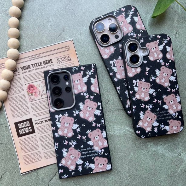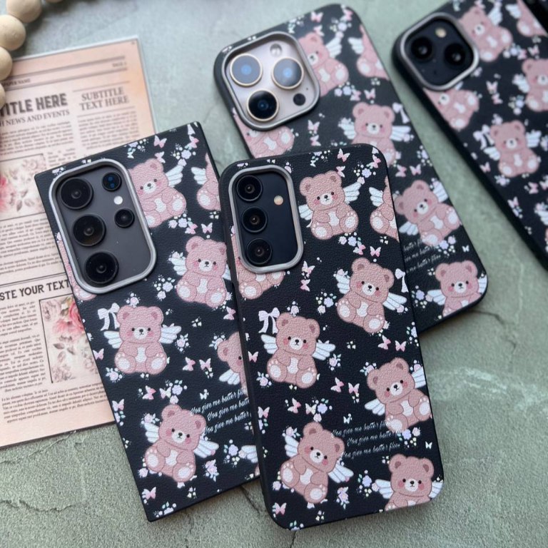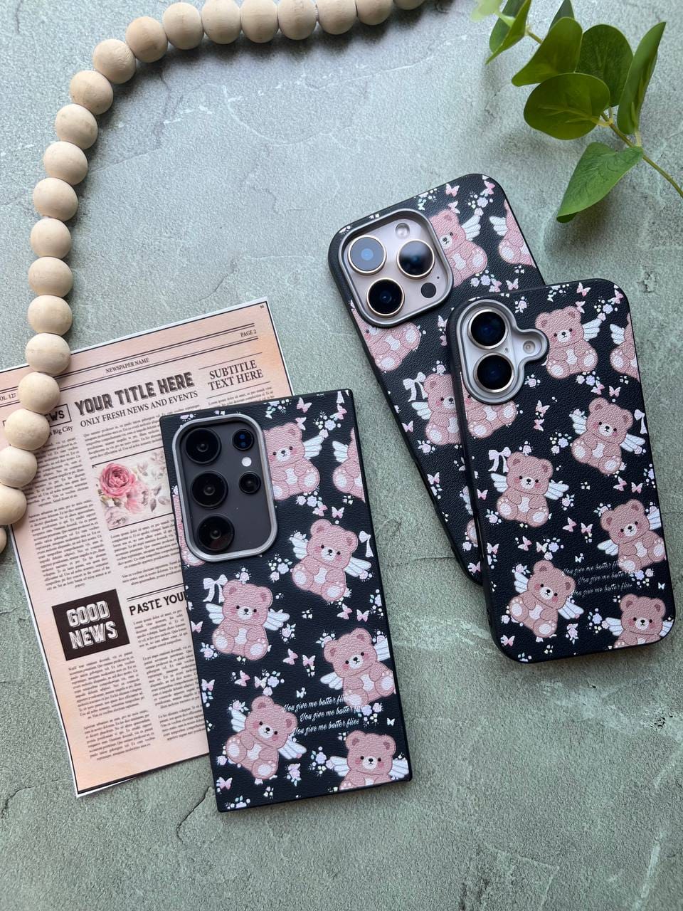 قاب‌ فانتزی با طراحی خاص و دلبر ✨📱 اگه دنبال یه قاب گوشی متفاوت، خاص و فوق‌العاده بامزه‌ای، این مدلای خرسی می‌تونن دلتو ببرن! 🧸💕 🌸 جنس باکیفیت و خوش‌دست 🎀 طرح خرس‌های فرشته‌ای با گل و پروانه 🖤 پس‌زمینه مشکی با بافت چرمیم