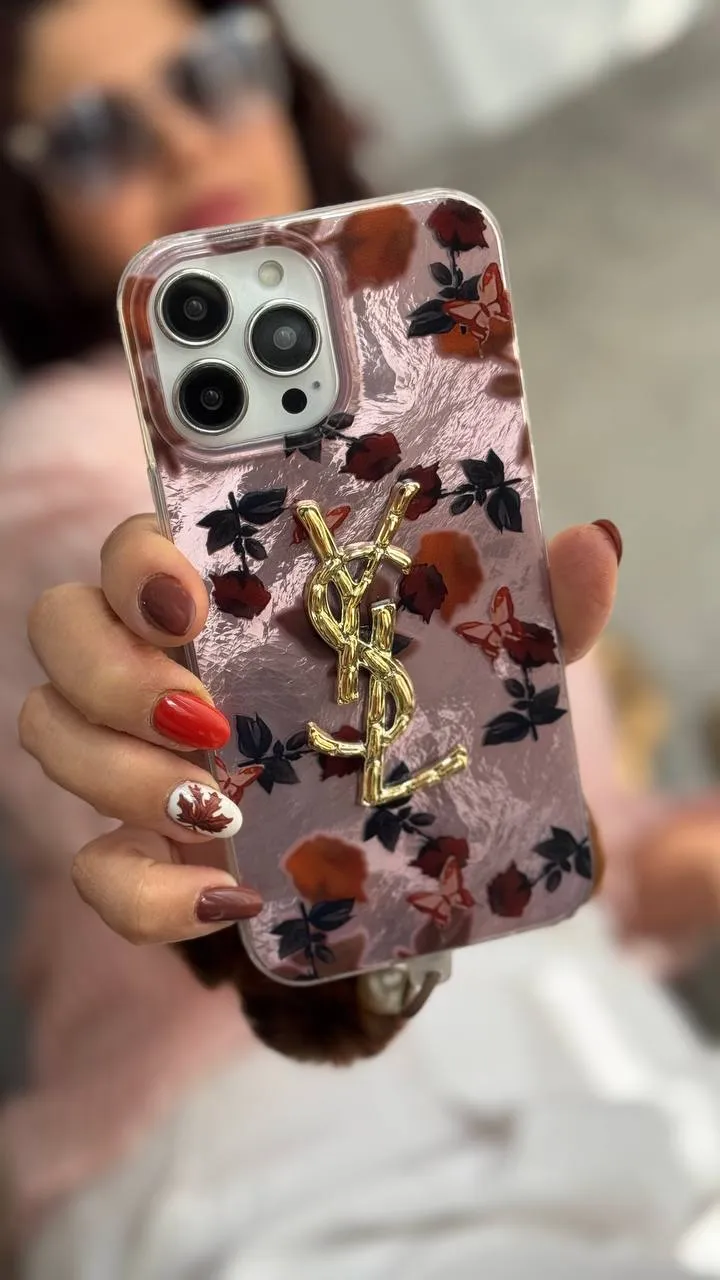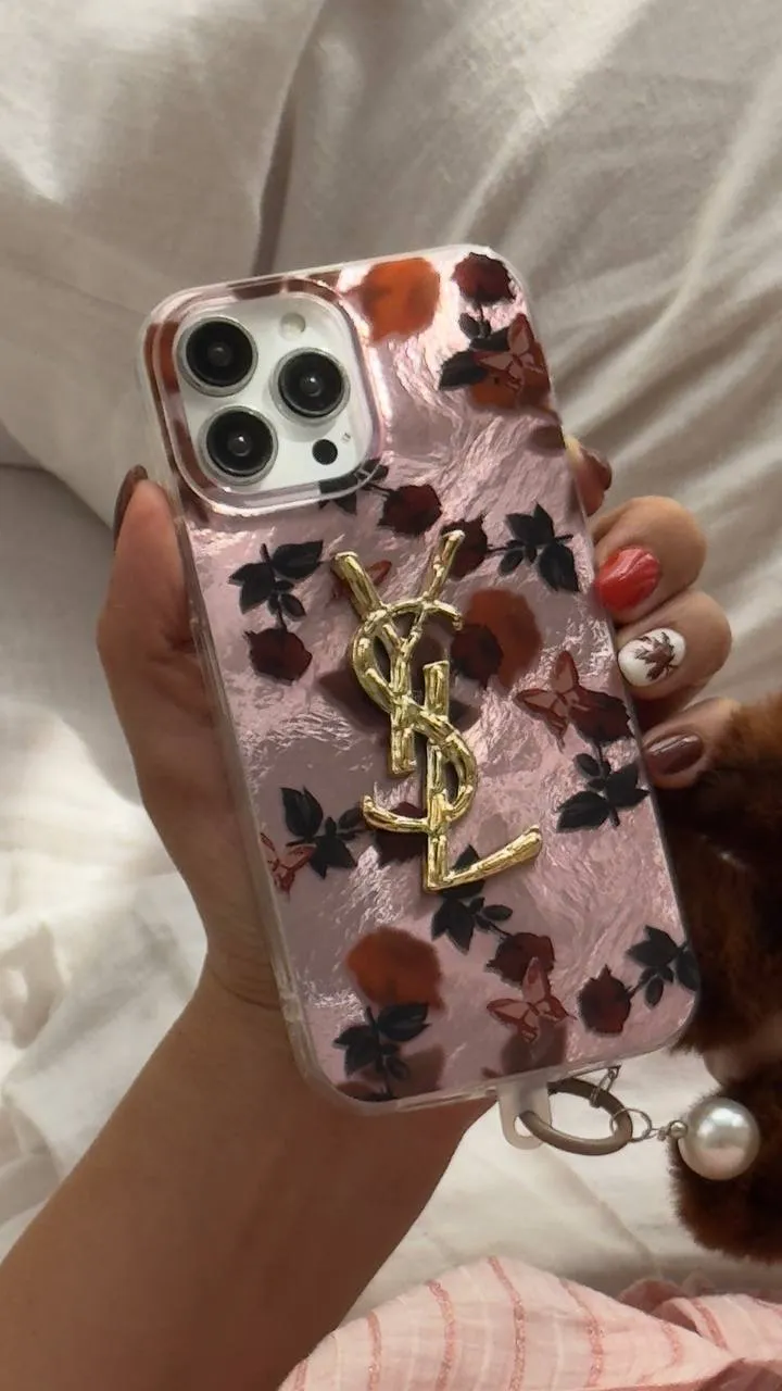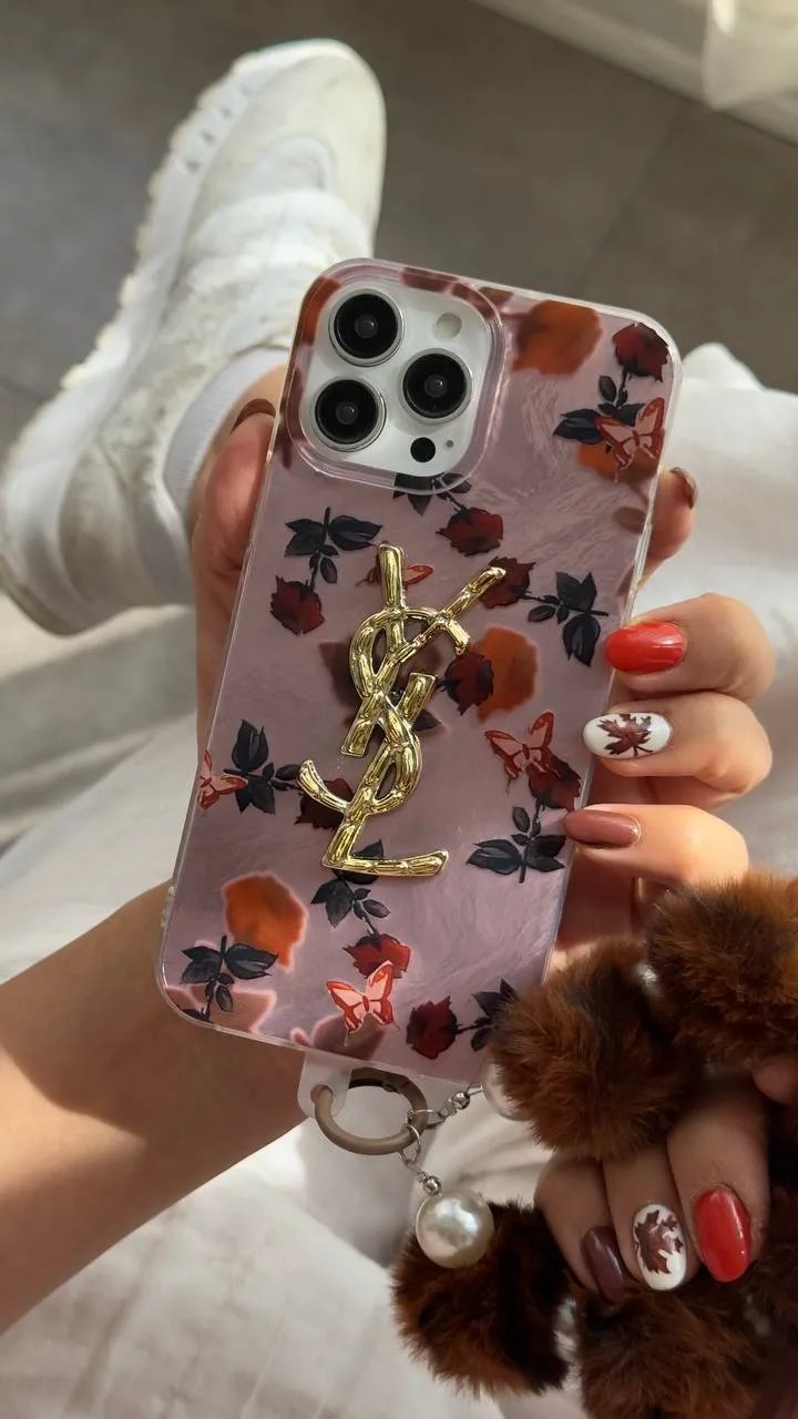 قاب موبایل آیفون سن لورن دم روباهی پروانه گل سرخ + بندست پشمی
