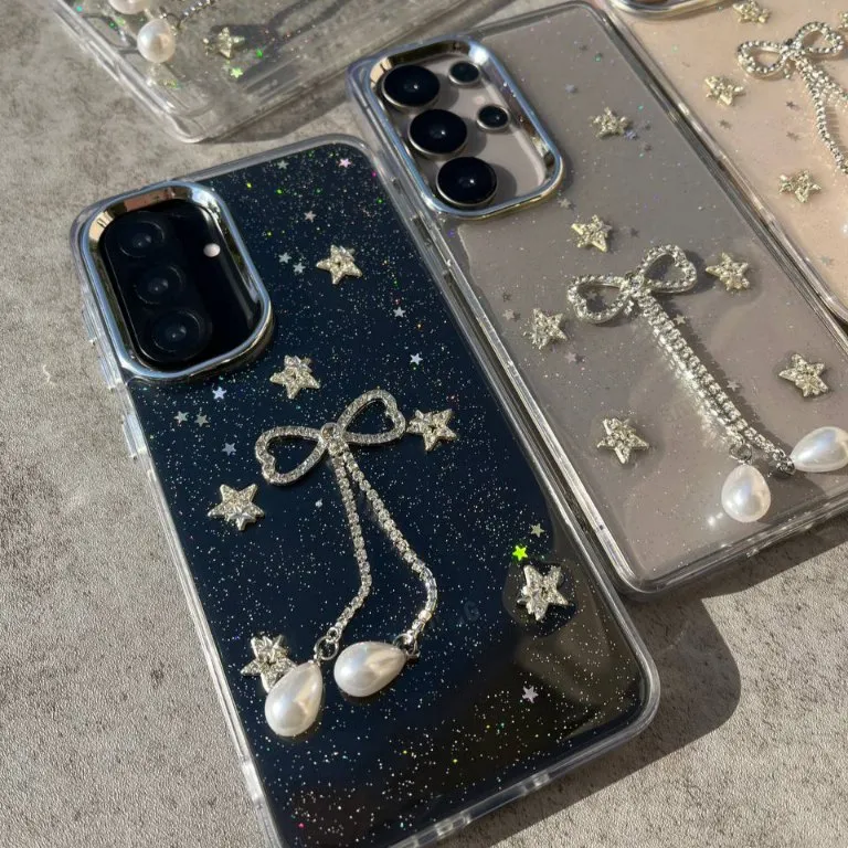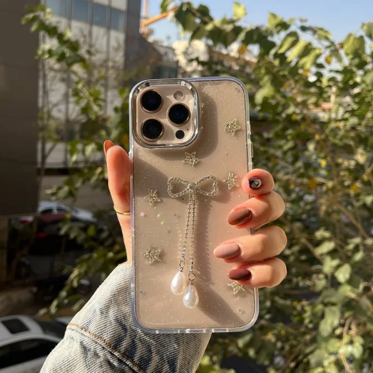 TPUقاب از جنس شفاف و نرم هست که انعطافپذیره و به خوبی از گوشی در برابر ضربه و خط و خش محافظت میکنه. طرحهای کوچیک پاپیون مشکی روی زمینهی شفاف، ظاهر قاب رو مینیمال و دخترونه کرده. بندهای متصل به قاب هم از مهرههای مرواریدی و مشکی ساخته شدن، که ترکیبشون حس لوکس و خاص میده. پاپیونهای سیلیکونی مشکی که بین مهرهها قرار دارن، جلوهی قاب رو خیلی خاصتر و فانتزیتر میکنن